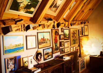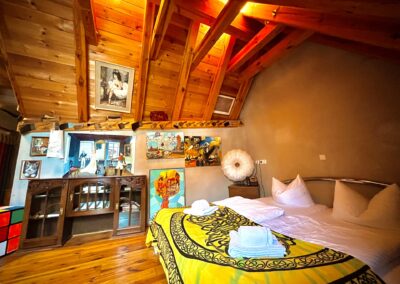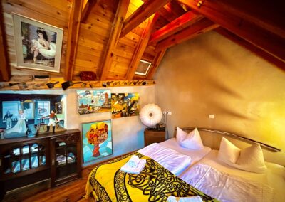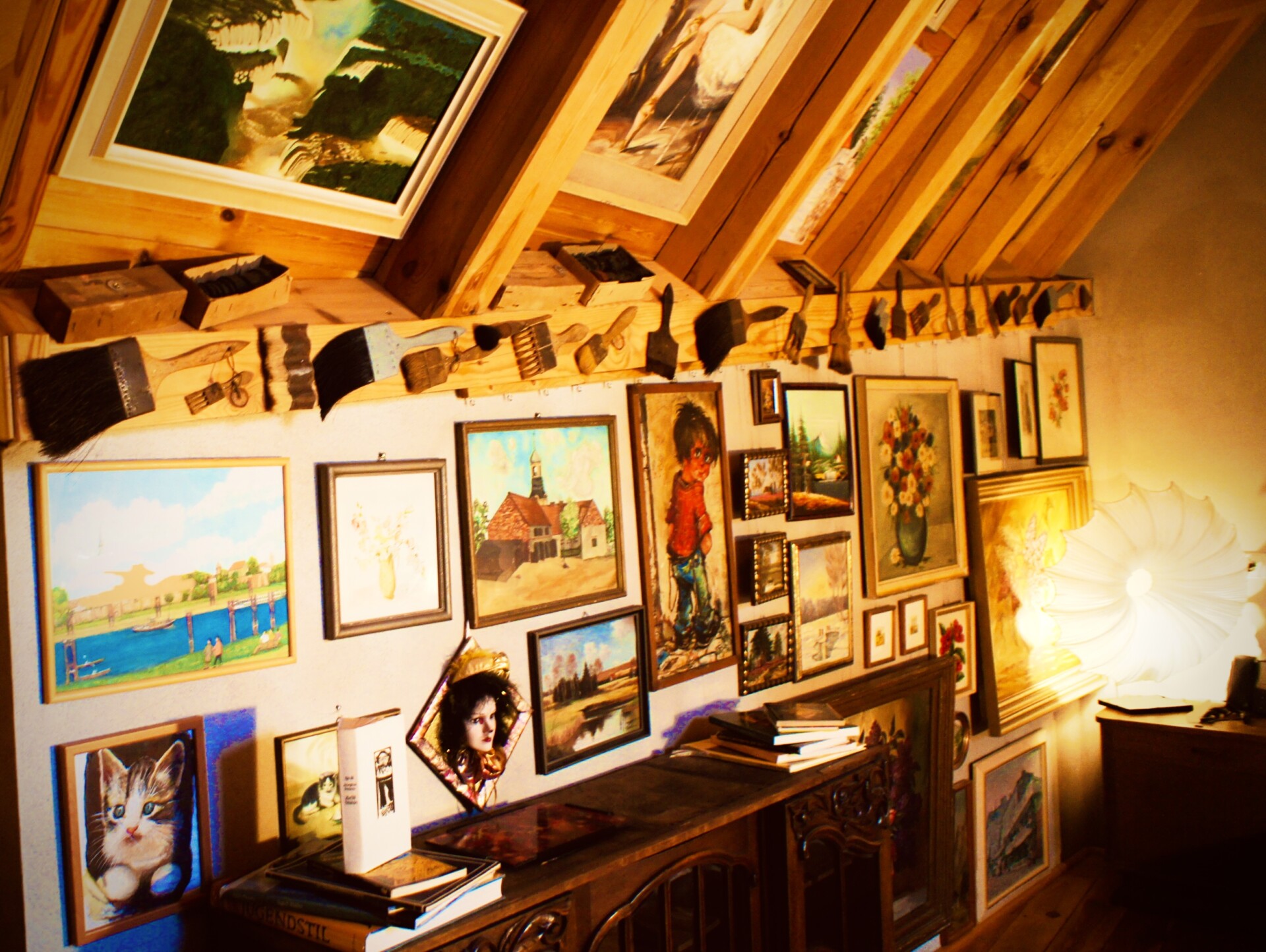 Das kunterbunte Künstlerzimmer ist ein Themendoppelzimmer, wie Sie es sich verrückter nicht vorstellen können. Bilder verschiedenster Epochen hängen an den Wänden, viele Künstlerutensilien wie Pinsel und Farbeimer sind im Raum verstreut. Das Badezimmer erinnert sehr an Hundertwassers Philosophie: je schräger und individueller, desto besser. Mannes Maleratelier ist ein Denkmal für unseren Haus- und Hofmaler Manfred "Manne" Beckmann (1955-2014). Mit seinen kleinen und großen Kunstwerken ist er in Tangermünde und der Altmark vertreten. Manne selbst gehörte seit mehr als 20 Jahren zum Bild der mittelalterlichen Innenstadt Tangermündes.