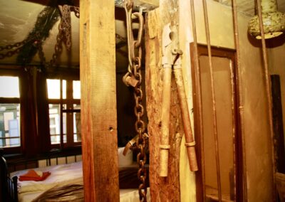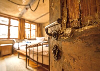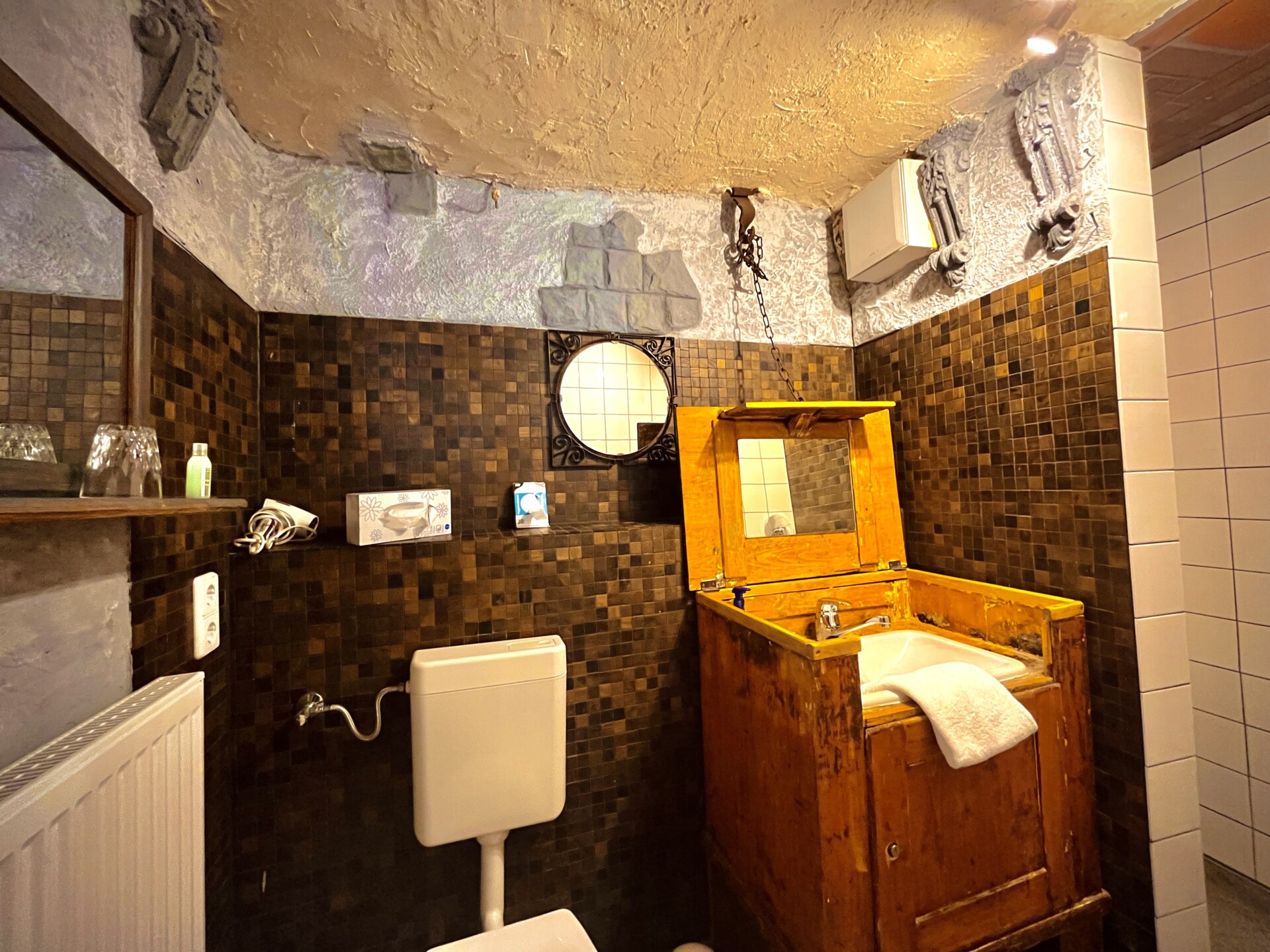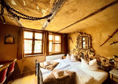 Winsels Folterkammer erinnert mit ihrem mittelalterlichen Inventar an die düsteren Zeiten des Mittelalters. Morgensterne und Äxte zieren die Lehmwände, indirektes Licht und ein großzügiges Bett erhöhen den Schlafkomfort. Selbst das Bad ist rustikal eingerichtet, so dass Sie sich schnell in die Zeiten von Folter und Knechtschaft hinein versetzen können.