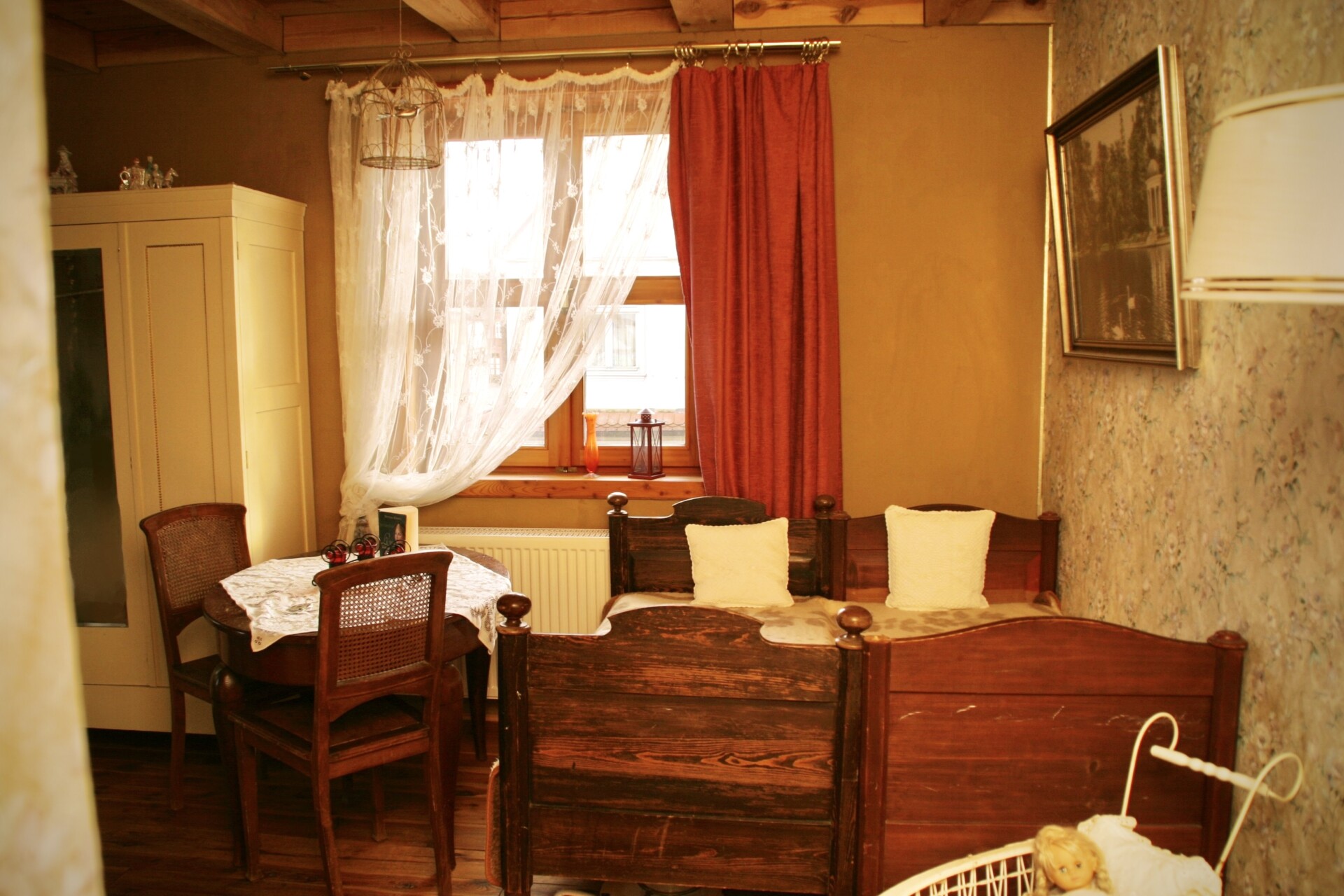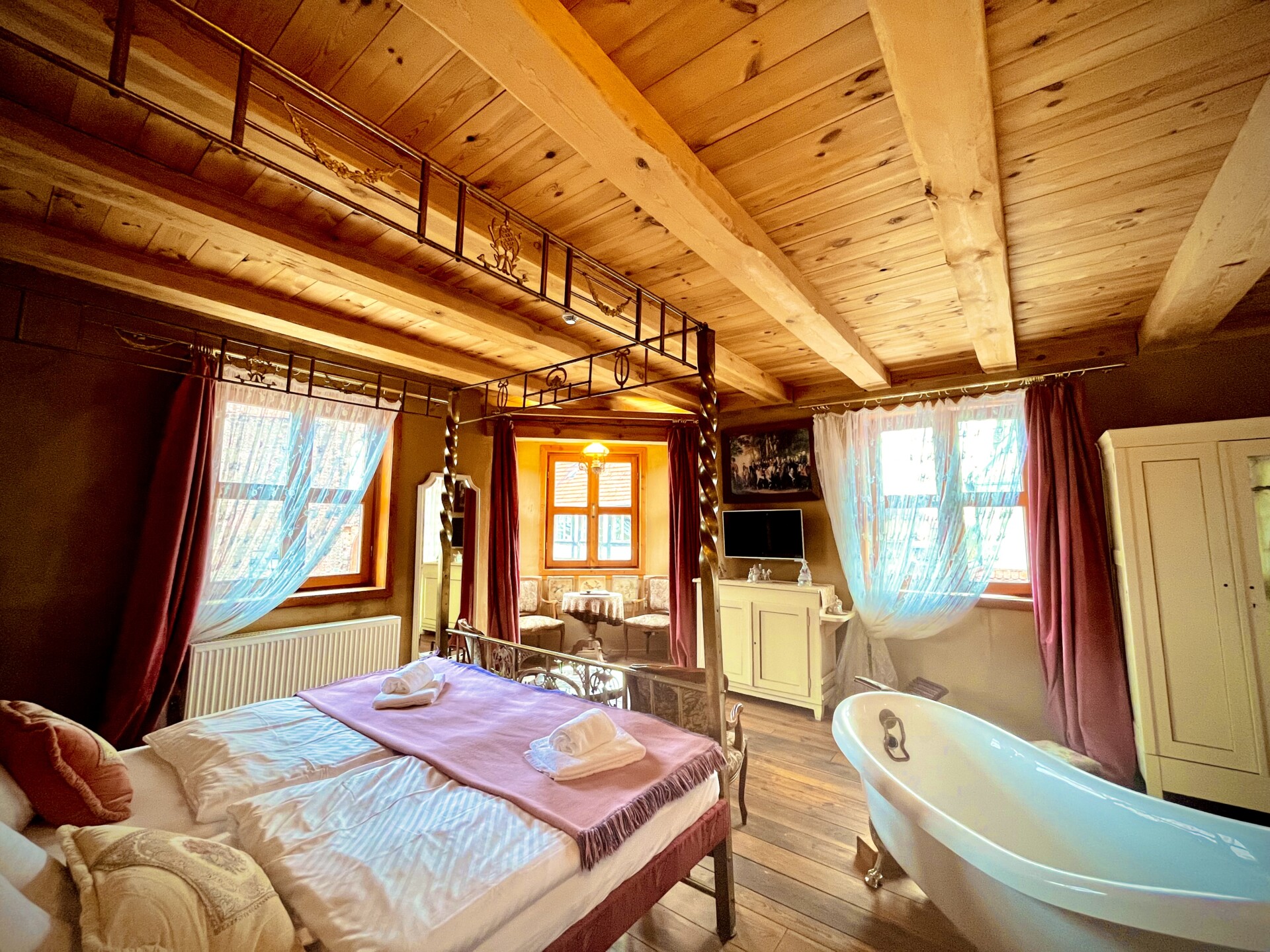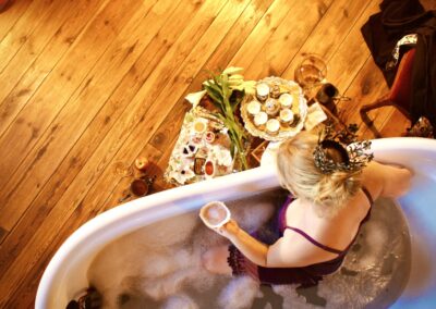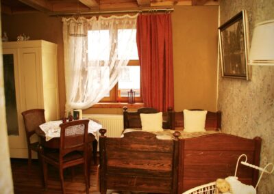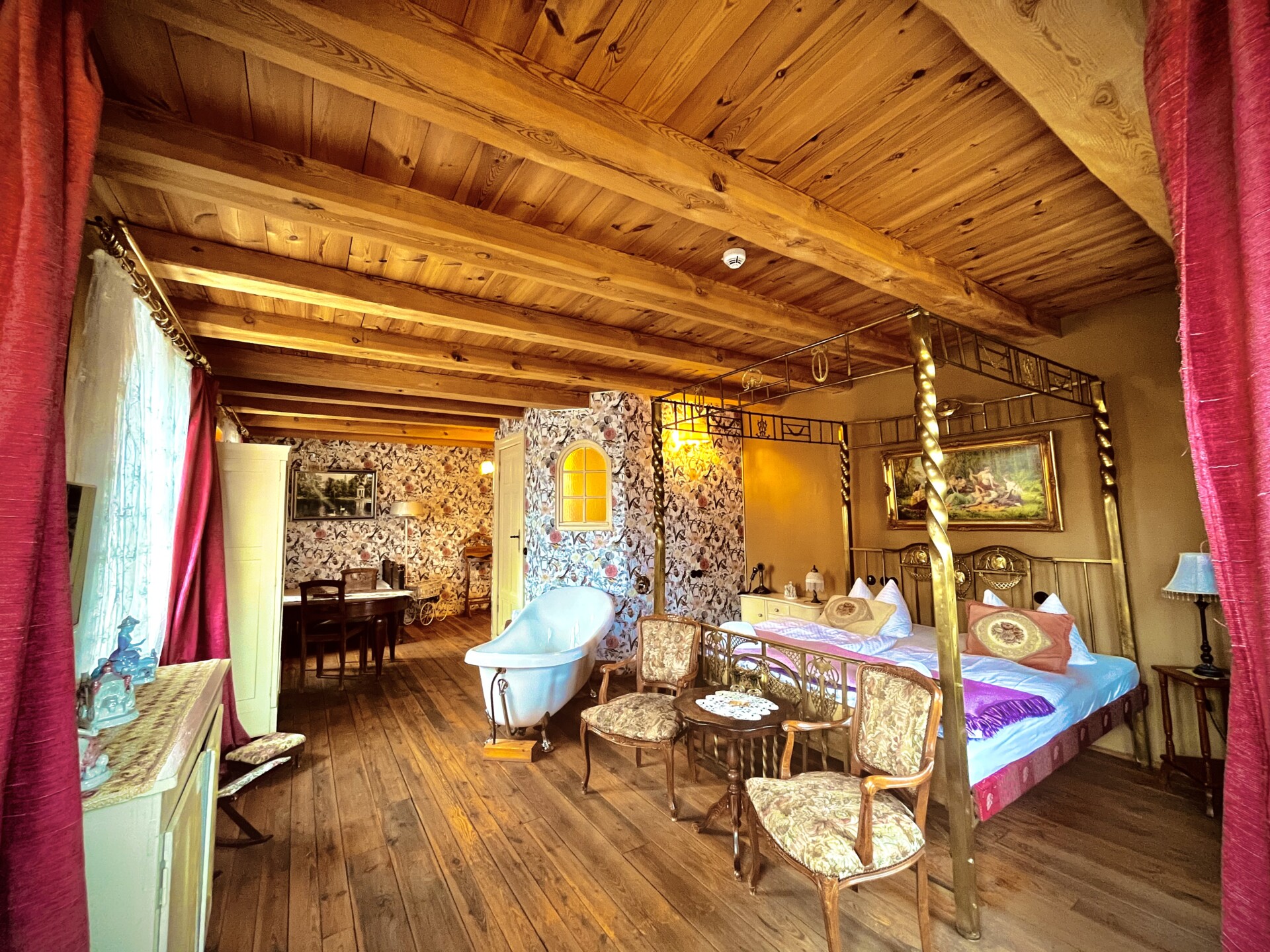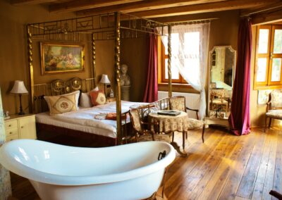 Dieser Salon ist eine Reminiszenz an die junge Königin Luise von Preußen. Mit edlem Messingbett in großzügig angelegtem Zimmer, das Tags von Licht durchstrahlt wird, fühlen Sie sich herrschaftlich. Die liebevoll zusammengestellten Möbeln spiegeln die Anmut der Königin wider, die zentral im Raum gelegene Badewanne ist Sinnbild für Luxus und lädt zu einem Verwöhnbad ein. Hier erleben Sie eine Übernachtung der besonderen Art.