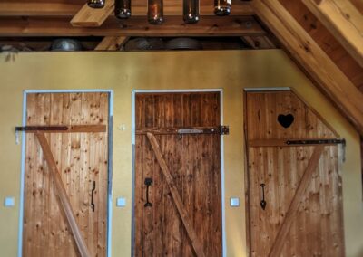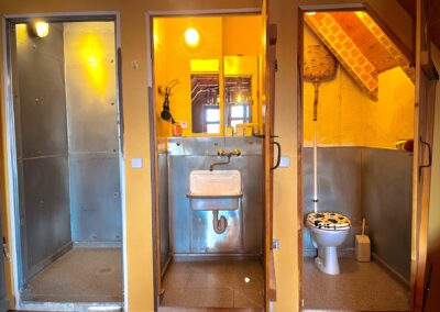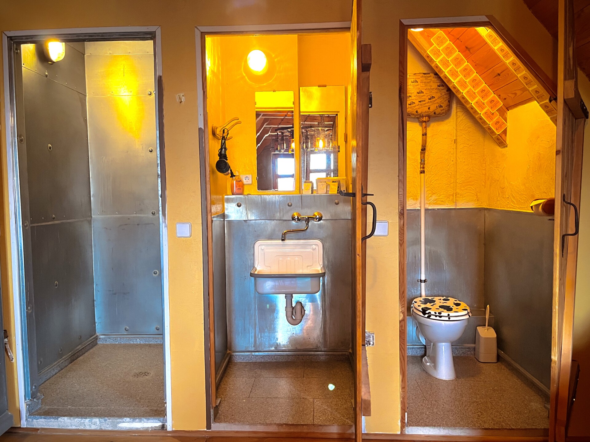 Der rustikale "Stall der Kuh welche ihren Schwanz in Bier badete" ist ein geräumiges Komfortzimmer mit Möbeln wie zu Omas Zeiten, einem hölzernen Badezubern und Kuhglocken auf der Toilette. Durch ein kleines Extra-Bett ist der Aufenthalt für die ganze Familie in diesem Zimmer angenehm machbar.