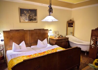 Das Schokoladenzimmer ist eine süße Versuchung für alle Leckermäulchen. Hier können Sie sich das romantische Schokoladenmenü bestellen und in der Wanne sitzend mit ihrem Liebsten plaudern, der es sich im Bett gemütlich macht.