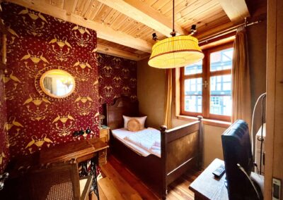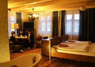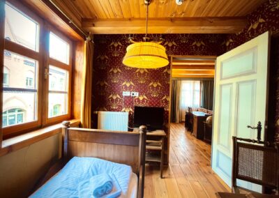 Der Name dieses schönen Komfortzimmers weist auf die Jahrzehnte alte Tradition der Zuckerherstellung in Tangermünde hin. Das Interieur ist bestimmt durch den bürgerlichen Haushalt der 20er Jahre des vergangenen Jahrhunderts. Clubsessel, ein großzügiges Bett und ein schönes Bad im Jugendstil vermitteln Wohlfühlcharakter.