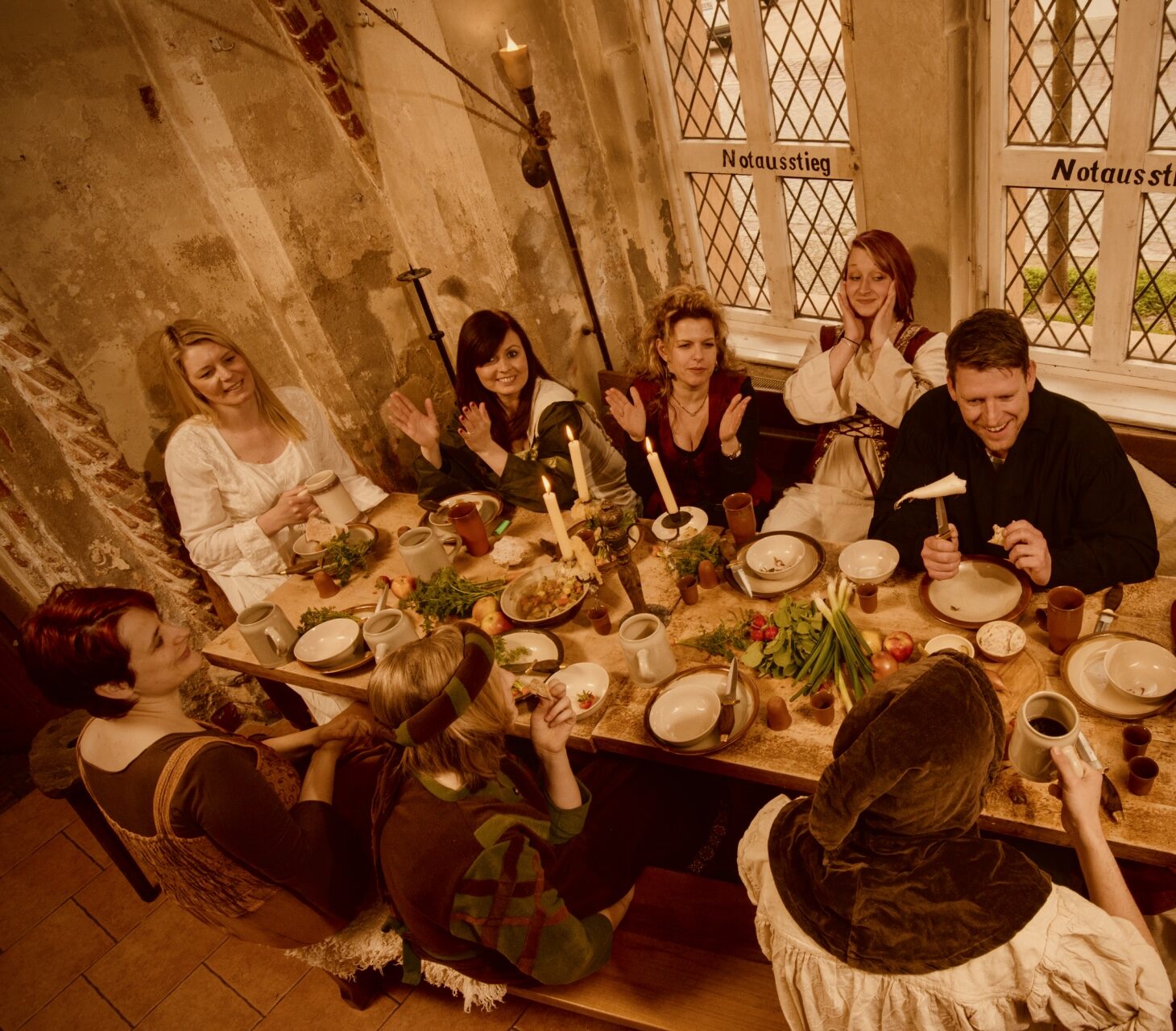 Festgelage mit mehreren Gängen, Gesang und Musik des Mittelalters, Gesöff aus dem Krug, Gedichte und frivole Reden, Met aus dem Horn, Beleuchtung nur mit Kerzen, Baden im Holzzuber (und Schwiegermutter oder Chef angekettet im Pranger!).